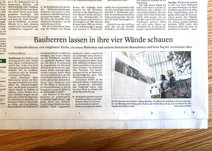 Die Thüringer Allgemeine Zeitung berichtet heute im Nordhäuser Teil über den Tag der Architektur 2018 in Nordthüringen: https://nordhausen.thueringer-allgemeine.de/...