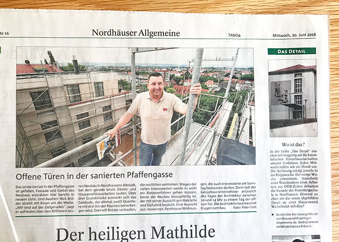 Am 23.06.2018 öffnet der Bauherr die Baustelle in der Nordhäuser Pfaffengasse für potentielle Mieter und Käufer sowie interessierte Besucher. Zwischen 10 und 14Uhr können alle Wohnungen besichtigt werden. Die Thüringer Allgemeine berichtet unter: https://www.thueringer-allgemeine.de/...